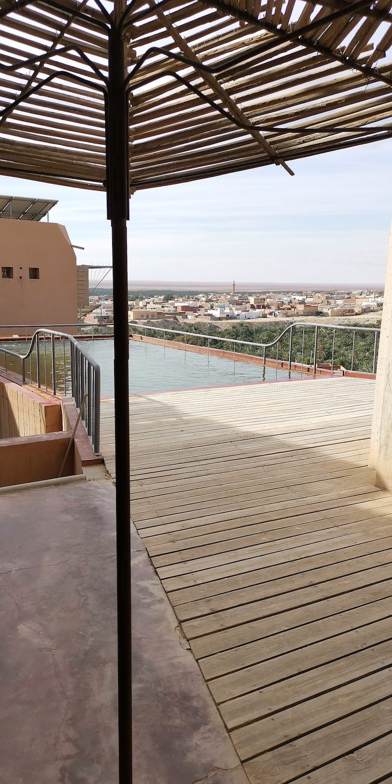 - Blick über den Thermalwasser-Pool des Dar Hi über einen Palmenhain nach Nefta.