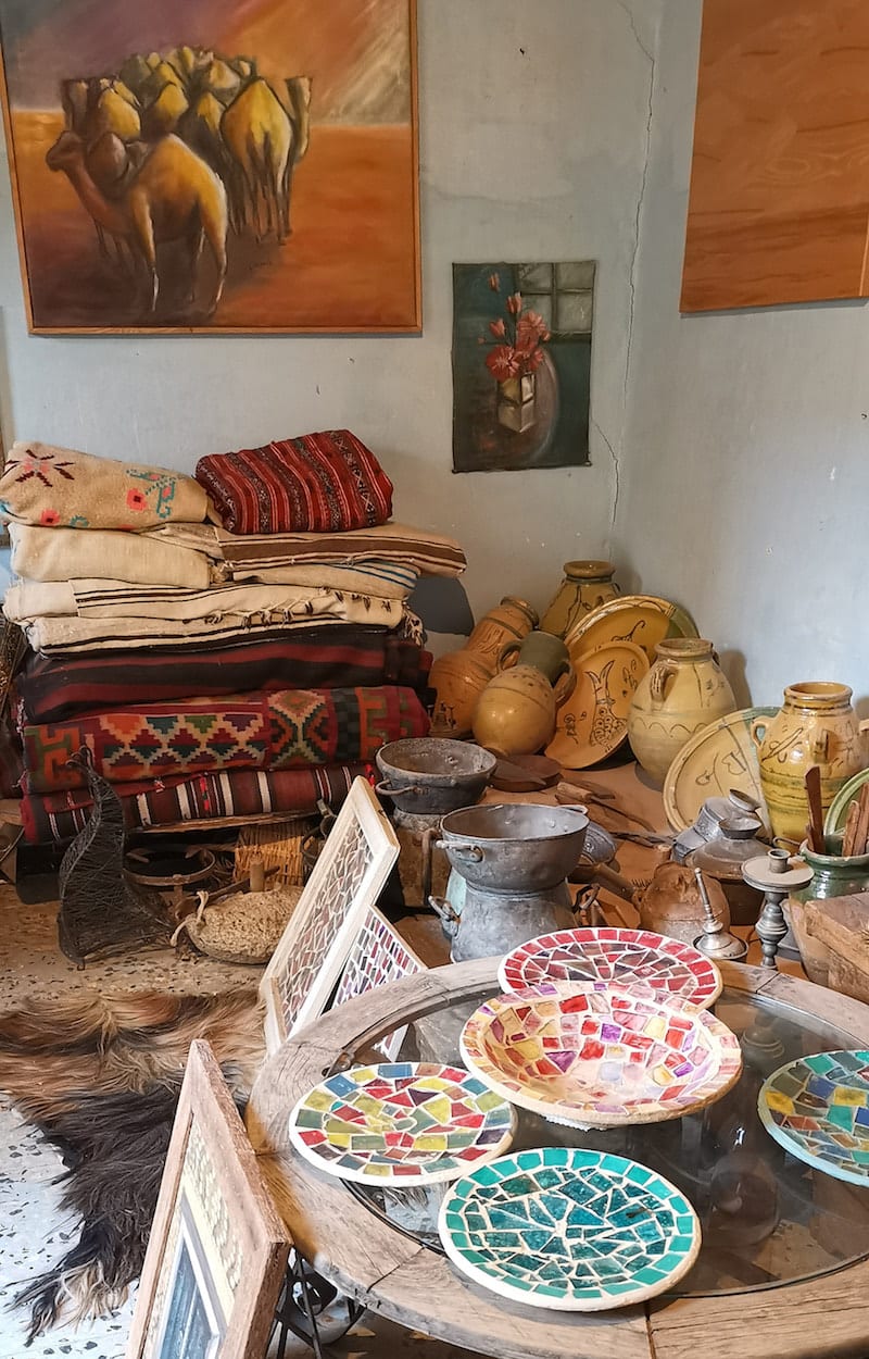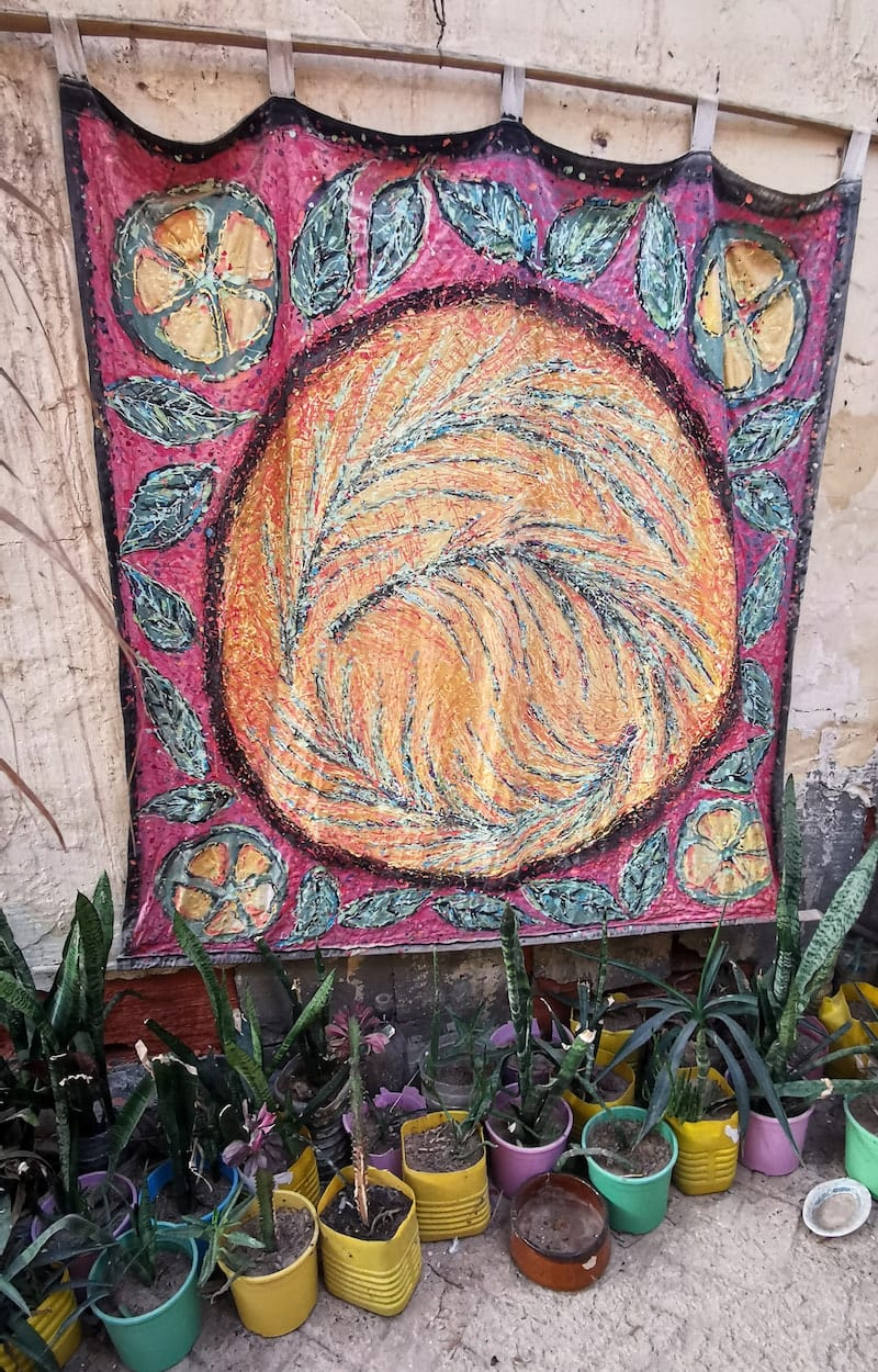 Wer die Schwelle der Galerie Tozart in der Altstadt von Tozeur übertritt, steht nach wenigen Schritten im Innenhof. Dies ist das Freiluft-Wohnzimmer von Raoudha Bribech. Schon zweimal durfte ich die Künstlerin in ihrem Reich besuchen. Ich muss zugeben, dass ich gerne zu Gast bin bei der selbstbewussten Frau, die alleine hier in der Medina lebt und arbeitet. Raoudha ist ein Allroundtalent. Sie malt wunderschöne Bilder und Wandbehänge, töpfert und gestaltet Mosaikgegenstände. Sogar den Gürtel, den Raoudha bei meinem jüngsten Besuch trägt, hat sie selbst gemacht. Und: Ich liebe ihren Innenhof mit dem geschmackvoll zusammengestellten Sammelsurium aus Pflanzen und Kunstwerken.