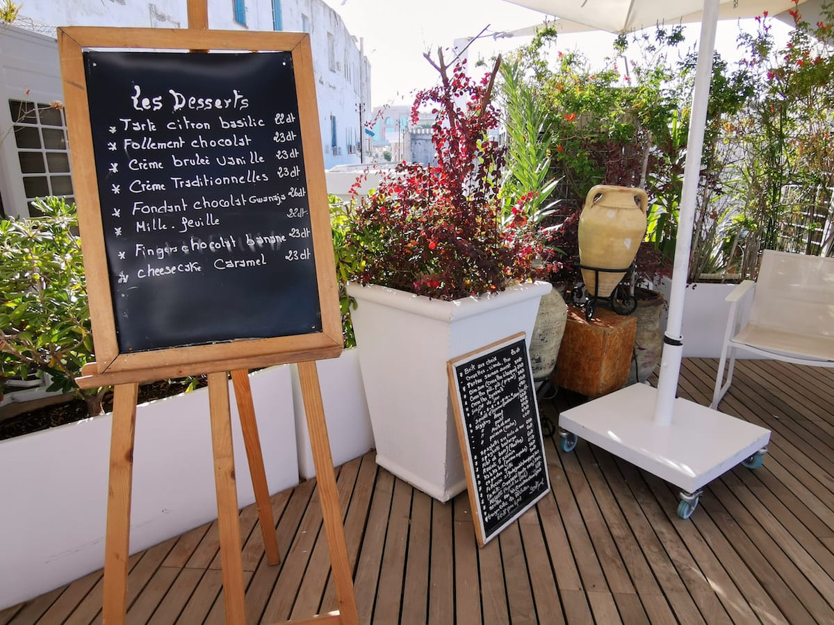 - Desert- und Speisekarte in der Rooftop Bar des Dar El Jeld – das Essen ist absolut empfehlenswert.