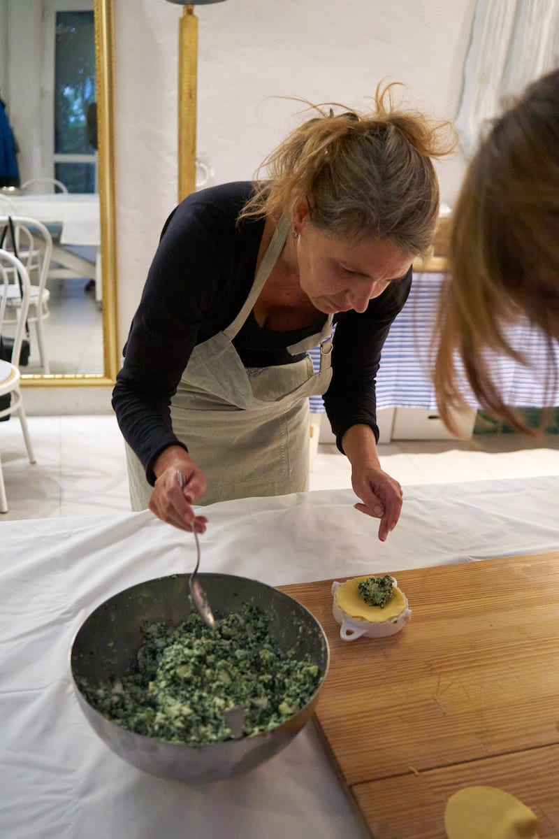 Im Laufe der Woche gibt es auch einen Fisch-Tag und einen Nudel-Tag. An letzterem bringt Ornella ihren Mann mit. Franco gilt als Meister an der Nudelmaschine. Unter seiner Anleitung fertigen wir Mezzelune – wörtlich Halbmonde – mit einer Ricotta-Spinat-Füllung und frische Tagliatelle. Zu den Bandnudeln gibt es übrigens ein Wildschwein-Ragout, das schon mehrere Tage lang mit Rosmarin und Wacholderbeeren köchelte – ebenfalls eine Spezialität Ornellas.