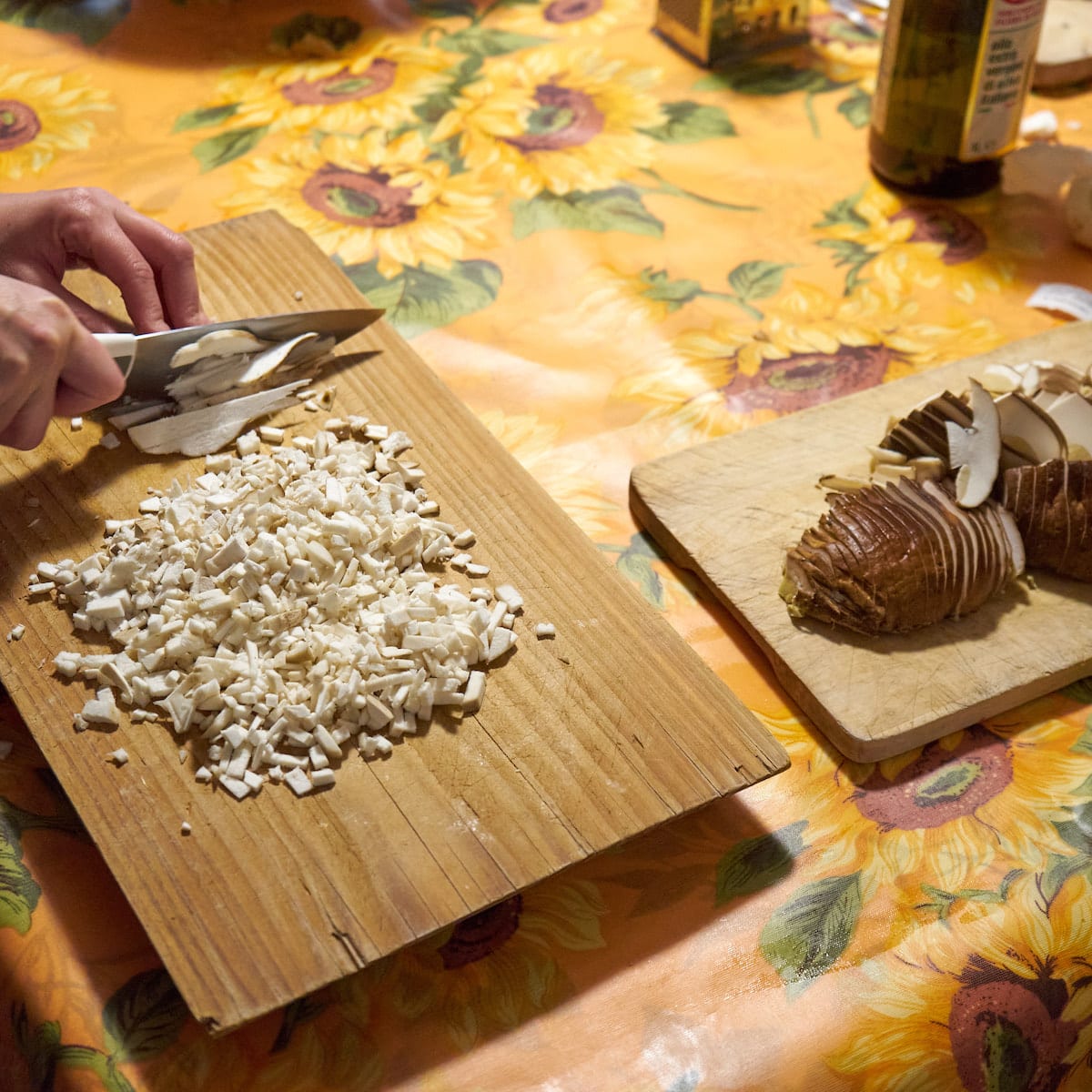 Für das Risotto hat Ornella Steinpilze, Parasol, Pfifferlinge und winzige „Pioppini“, einen regionalen Pilz Umbriens mitgebracht. Mit vereinten Kräften sind die Pilze schnell geputzt und geschnitten. Bei dieser Gelegenheit lernen wir, dass für Risotto grundsätzlich drei Töpfe benötigt werden: ein Topf für den Reis, ein Topf, um die geschmackgebenden Gemüse zu garen und einen für die heiße Brühe. Die Brühe wird schöpflöffelweise zum Reis gegeben – Freunden der italienischen Küche werde ich damit keine Neuigkeiten erzählen.