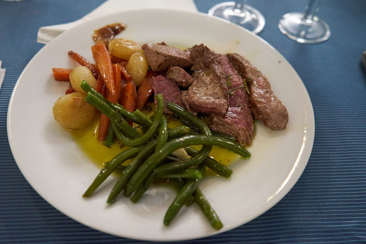 In der Küche hat Ornella derweil das Fleisch bei hoher Hitze angebraten, in Streifen geschnitten und auf dem Teller mit dem heißen Rosmarin-Öl übergossen. Es gilt, sich schnell mit bereitstehendem Gemüse zu versorgen und – zu genießen! Das Fleisch zergeht auf der Zunge und hier explodiert auch der Geschmack. Wahnsinn! So gut schmeckt Umbrien!